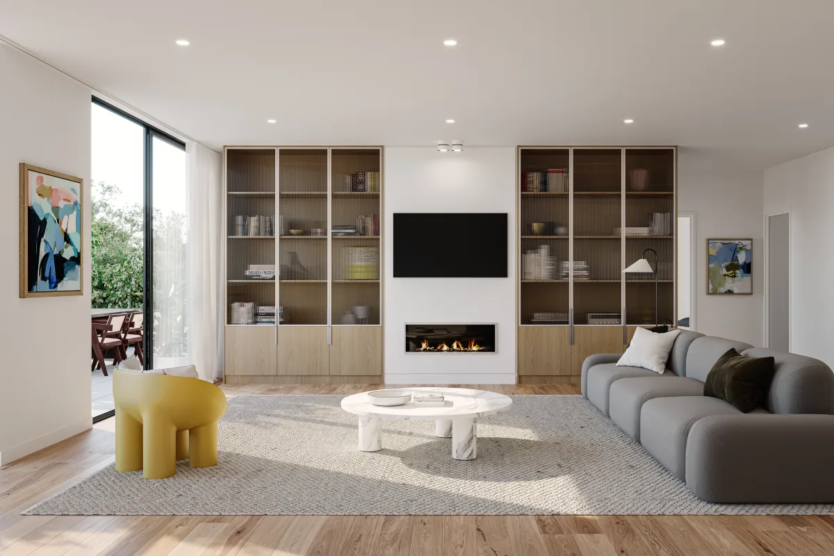 Phòng khách: cửa kính tràn từ sàn tới trần, đón ánh sáng tự nhiên, view nhìn ra CBD và Whitten Oval.